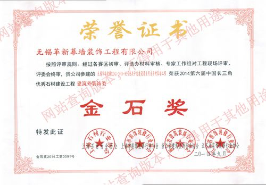 喜訊:熱烈祝賀我公司承建的無錫市胡埭鎮(zhèn)XDG-2010-83號地塊開發(fā)建設(shè)商業(yè)用房石材幕墻工程榮獲2014年金石獎