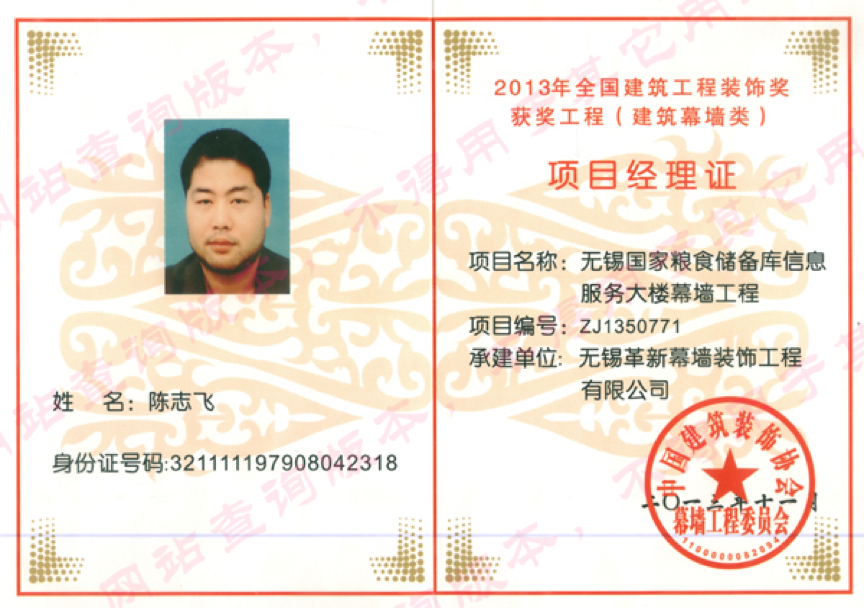 喜訊:熱烈祝賀我公司陳志飛同志獲“2013年全國優(yōu)秀項(xiàng)目經(jīng)理(建筑幕墻類)項(xiàng)目經(jīng)理證”稱號(hào)