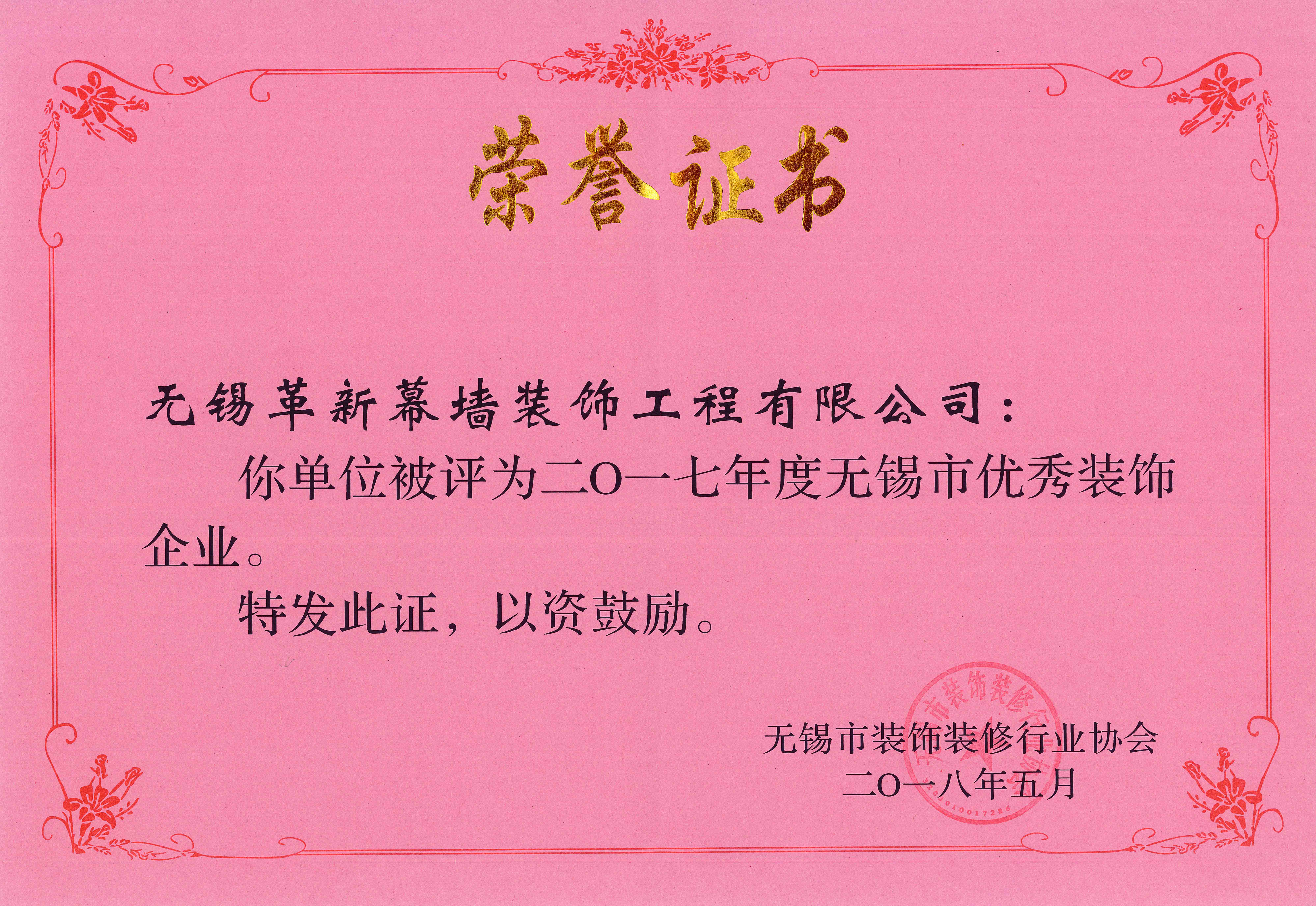 喜訊:熱烈祝賀我公司榮獲“2017年度無錫市優(yōu)秀裝飾企業(yè)”