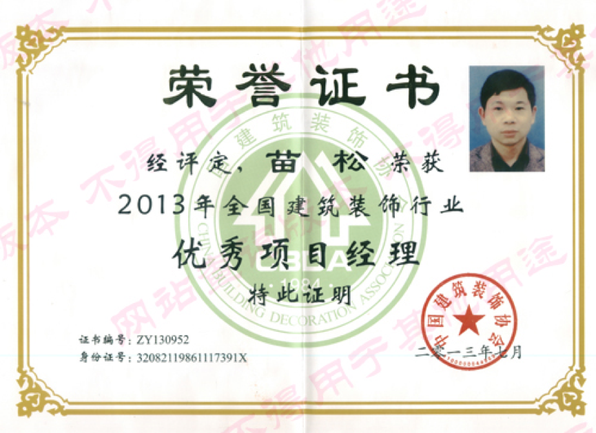 喜訊:熱烈祝賀我公司苗松同志獲“2013年全國(guó)建筑裝飾行業(yè)優(yōu)秀項(xiàng)目經(jīng)理”稱號(hào)