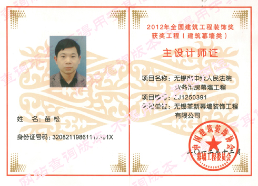 喜訊:熱烈祝賀我公司苗松同志獲“2012年全國(guó)優(yōu)秀項(xiàng)目經(jīng)理(建筑幕墻類)主設(shè)計(jì)師證”稱號(hào)