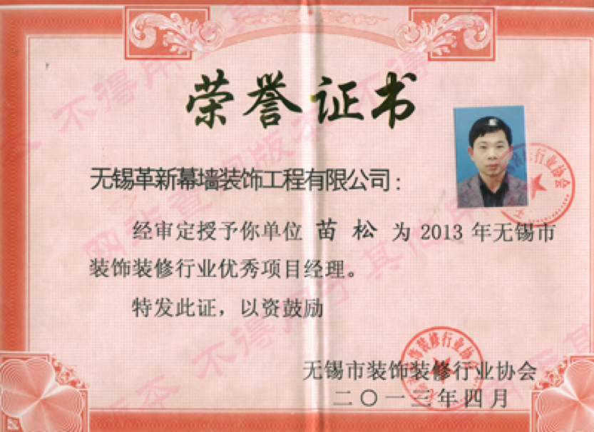 喜訊:熱烈祝賀我公司苗松同志獲“2013年無錫市裝飾裝修行業(yè)優(yōu)秀項(xiàng)目經(jīng)理”稱號