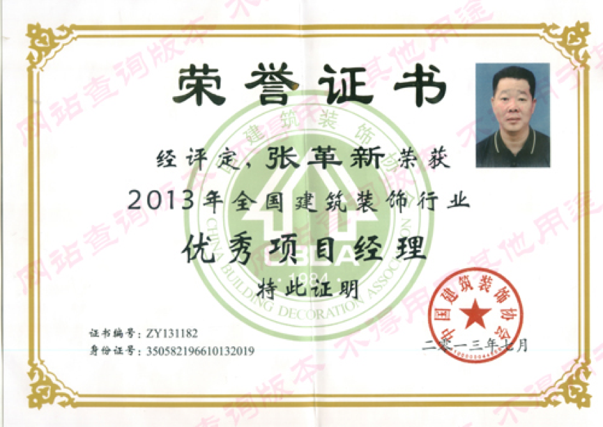 喜訊:熱烈祝賀我公司法定代表人張革新同志獲“2013年全國建筑裝飾行業(yè)優(yōu)秀項(xiàng)目經(jīng)理”稱號
