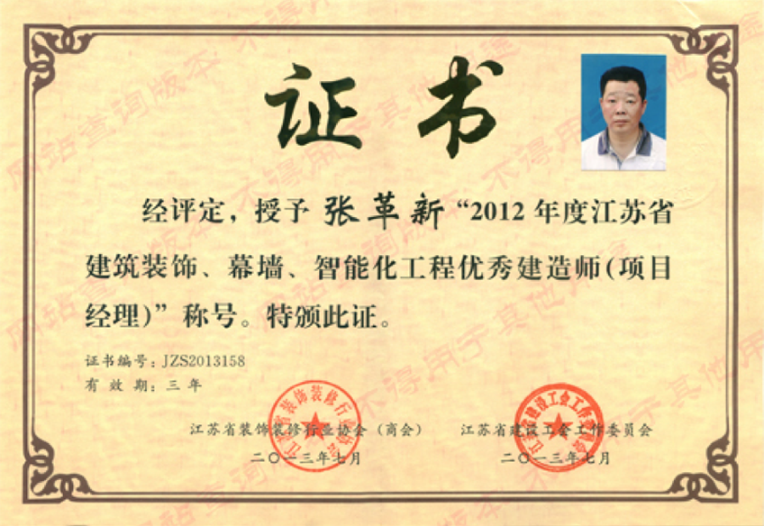 喜訊:熱烈祝賀我公司法定代表人張革新同志獲“2012年江蘇省建筑裝飾、幕墻、智能化工程優(yōu)秀建造師(項(xiàng)目經(jīng)理)”稱號