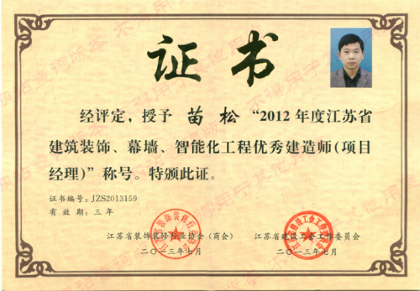 喜訊:熱烈祝賀我公司苗松同志獲“2012年江蘇省建筑裝飾、幕墻、智能化工程優(yōu)秀建造師(項目經(jīng)理)”稱號