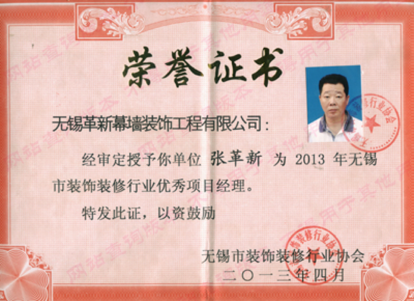 喜訊:熱烈祝賀我公司法定代表人張革新同志獲“2013年無錫市建筑裝飾工程優(yōu)秀建造師(項目經(jīng)理)”稱號