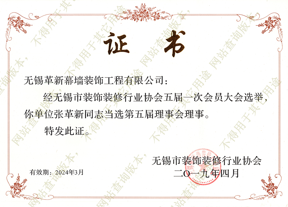 喜訊:熱烈祝賀我公司法定代表人張革新同志獲“2019年度無(wú)錫市裝飾協(xié)會(huì)(第五屆理事會(huì)理事)”稱號(hào)