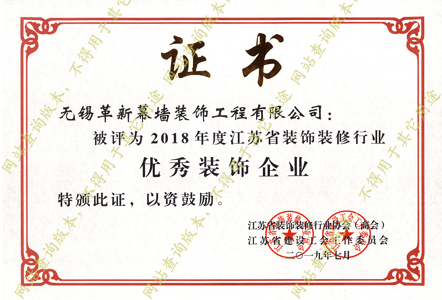 喜訊:熱烈祝賀我公司榮獲2018年度江蘇省裝飾裝修優(yōu)秀裝飾企業(yè)稱號(hào)