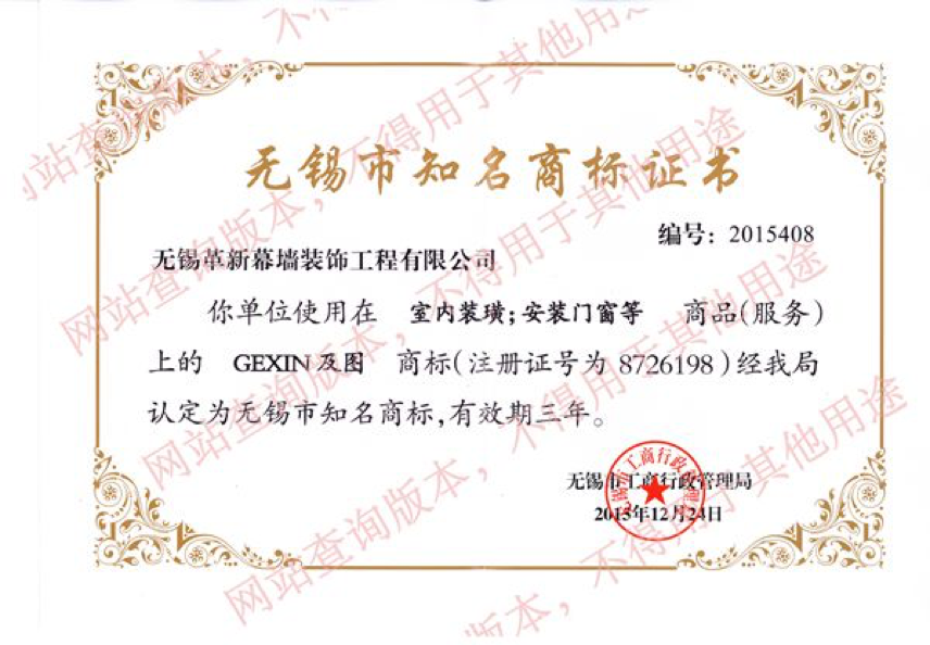 喜訊:熱烈祝賀我公司榮獲了2015年無錫市知名商標證書